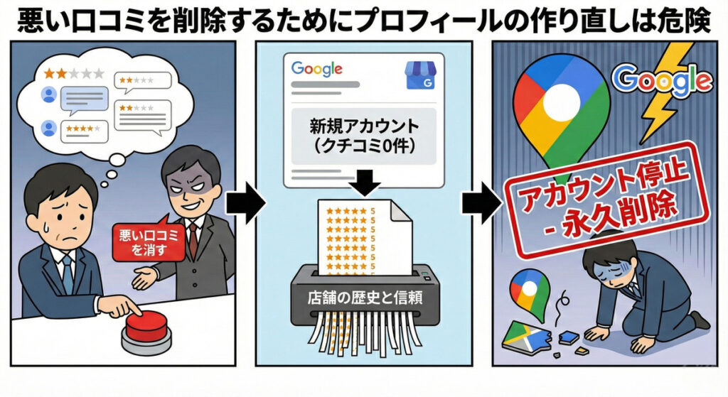 多くのケースで「ビジネスプロフィールの作り直し(別アカウント化)」という荒技を使います。 今のアカウントを削除し、新しいアカウントを登録し直せば、確かに悪い口コミは消えます。しかし、同時にこれまで積み上げてきた「良い口コミ」も「店舗の歴史」もすべて消滅します。