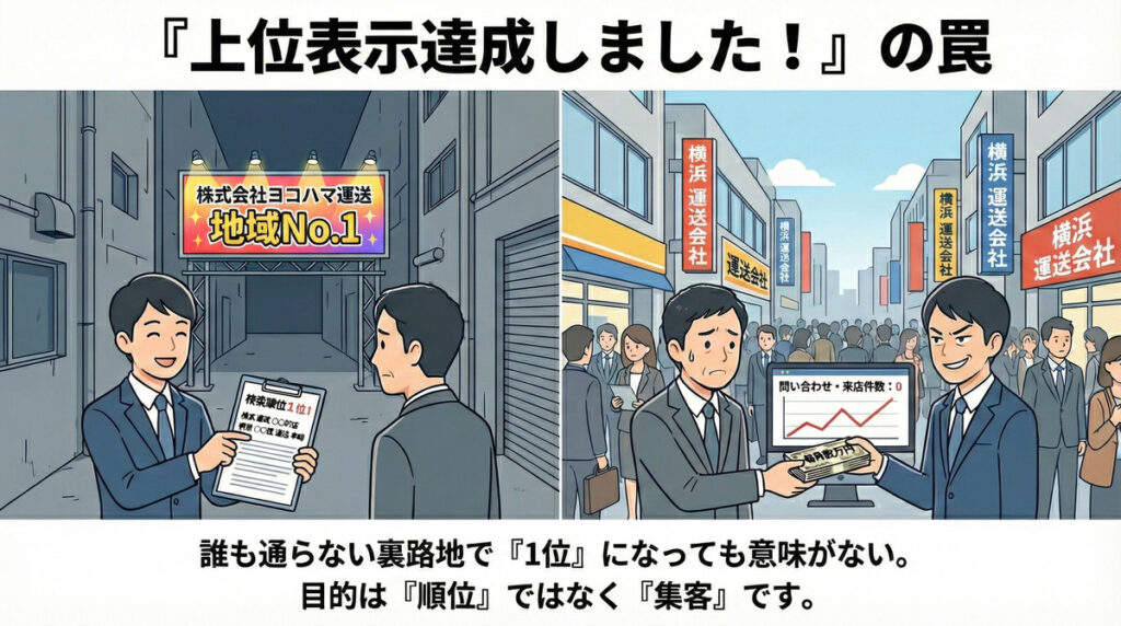 「順位」はあくまで手段であり、目的は「問い合わせや来店」のはず。 「順位さえ上げれば金になる」と考えている業者と付き合うと、毎月数万円の「ムダ金」を払い続けることになります。