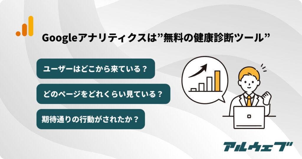 会社の健康状態を把握するために健康診断があるように、ホームページが元気か(=事業に貢献しているか)を調べるのがGoogleアナリティクスの役割です。